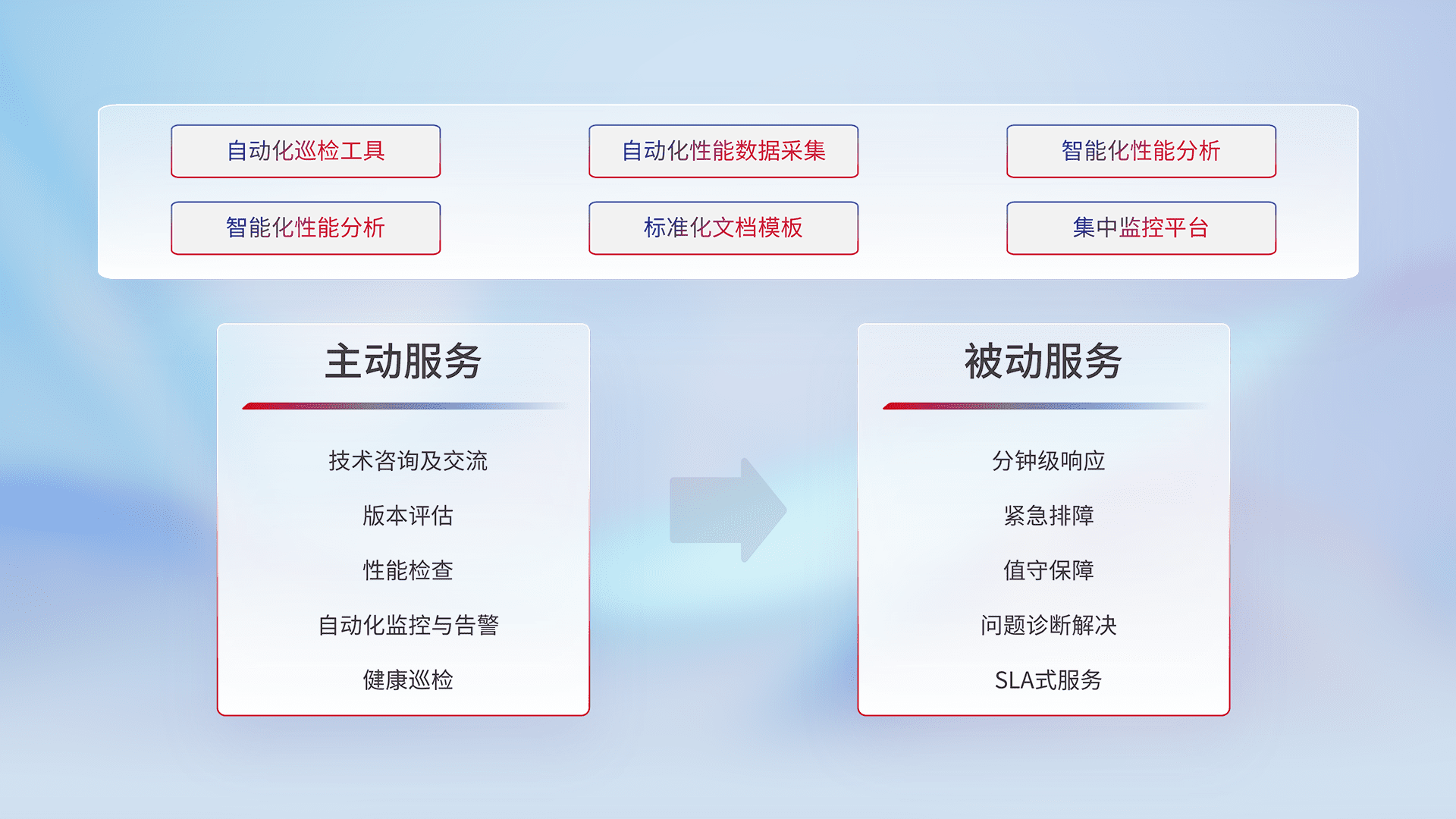 智能化工具和标准化文档,,,保障服务质量,,,提供主动服务(包含技术咨询、、版本评估、、、、性能检查、、自动化监控与告警、、、、健康巡检)和被动服务包含(分钟级响应、、、、紧急排障、、、值守保障、、、问题诊断解决、、、、SLA服务)。。。。