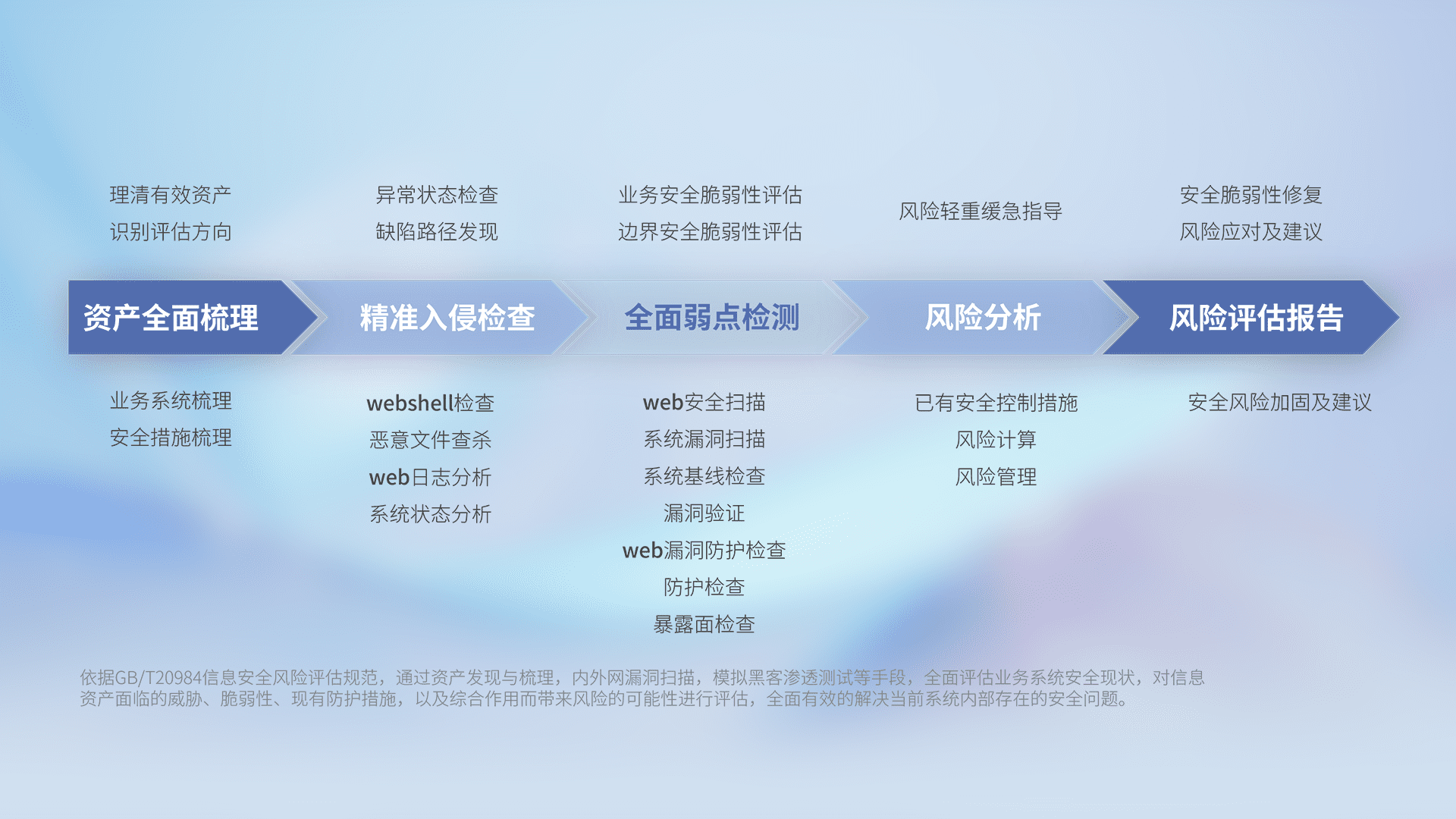 针对客户行业特性,,以专业的安全服务+多厂商联合解决方案提供专属的一站式安全管理服务,,,帮助客户全面感知网络空间威胁,,基于识别、、、、检测、、分析、、、防护、、、、监测、、响应的服务理论模型,,,从方案咨询、、、集成交付、、、、评估验证、、优化加固、、、运维运营,,致力于为客户提供完整的闭环管理式安全服务。。。以实战经验为客户打造高抵御风险的安全体系,,帮助客户发现威胁、、、对抗威胁、、、处置威胁,,,不断积累安全对抗能力,,持续保障数字化安全。。