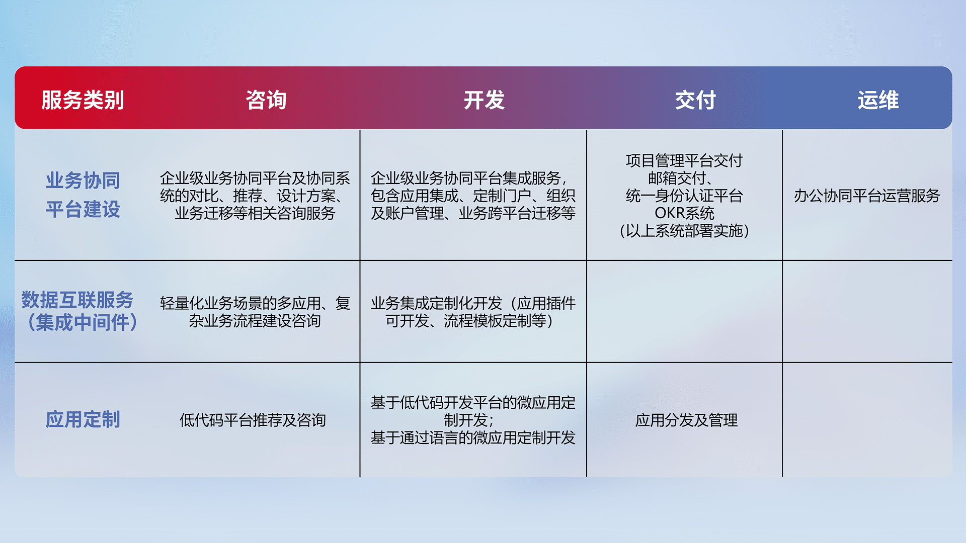 针对钉钉、、、、企微、、、IDaas等平台级产品提供产品的规划、、、方案、、、交付、、定制化开发等服务,,,实现如统一协同办公、、、、智能客户服务、、、混合会议管理、、、、智能数据查询、、、、等业务场景,,,实现数字化转型。。。